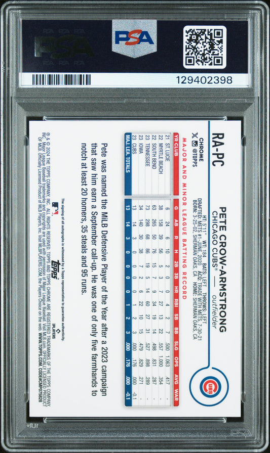 Pete Crow-Armstrong 2024 Topps Chrome Blue Refractor Rookie Auto #91/150 PSA 9 Auto 10