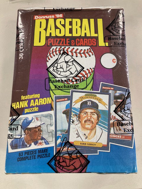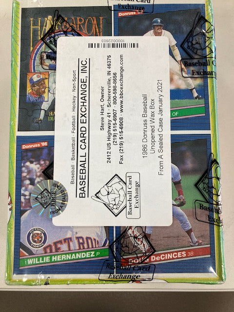 1986 Donruss Baseball wax box from a sealed case, January 2021. This box has been authenticated and wrapped by Baseball Card Exchange (BBCE).