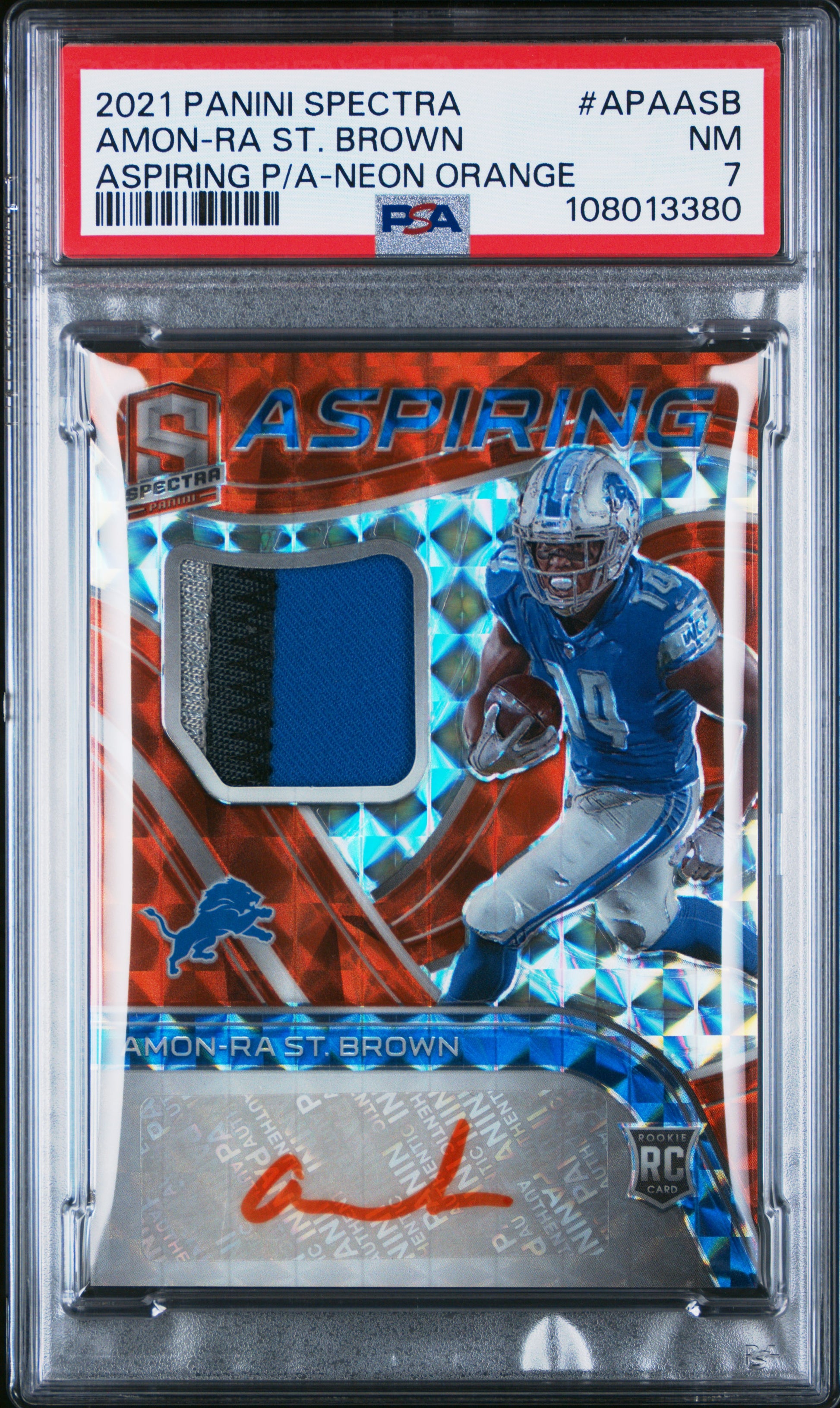 Amon-ra St. Brown 2021 Panini Spectra Neon Orange Rookie Patch Auto #8/15 PSA 7 Near Mint
