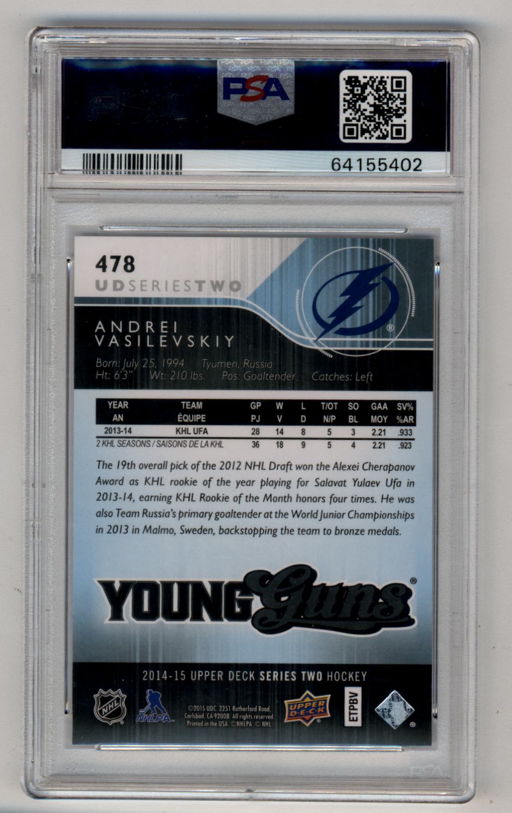 Andrei Vasilevskiy 2014-15 Upper Deck Young Gun #478 PSA 10 Gem Mint