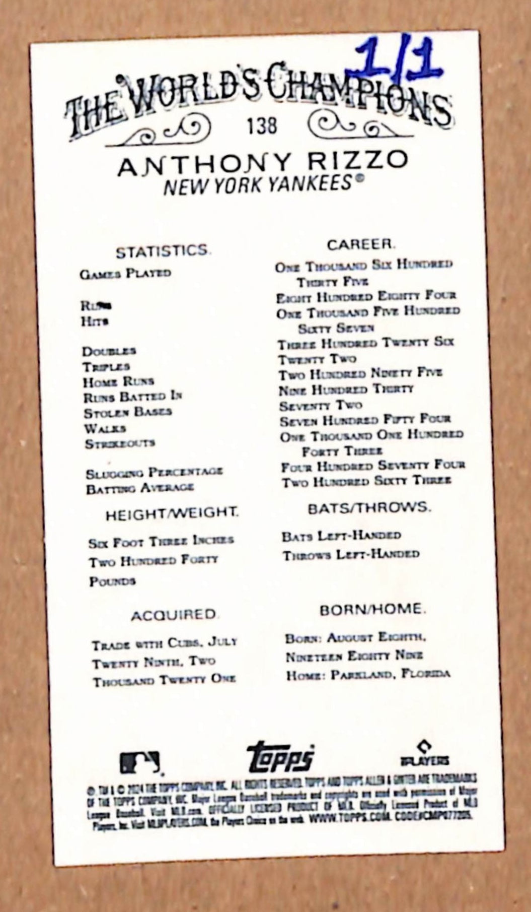 Anthony Rizzo 2024 Topps Allen and Ginter Platinum Mini 1/1