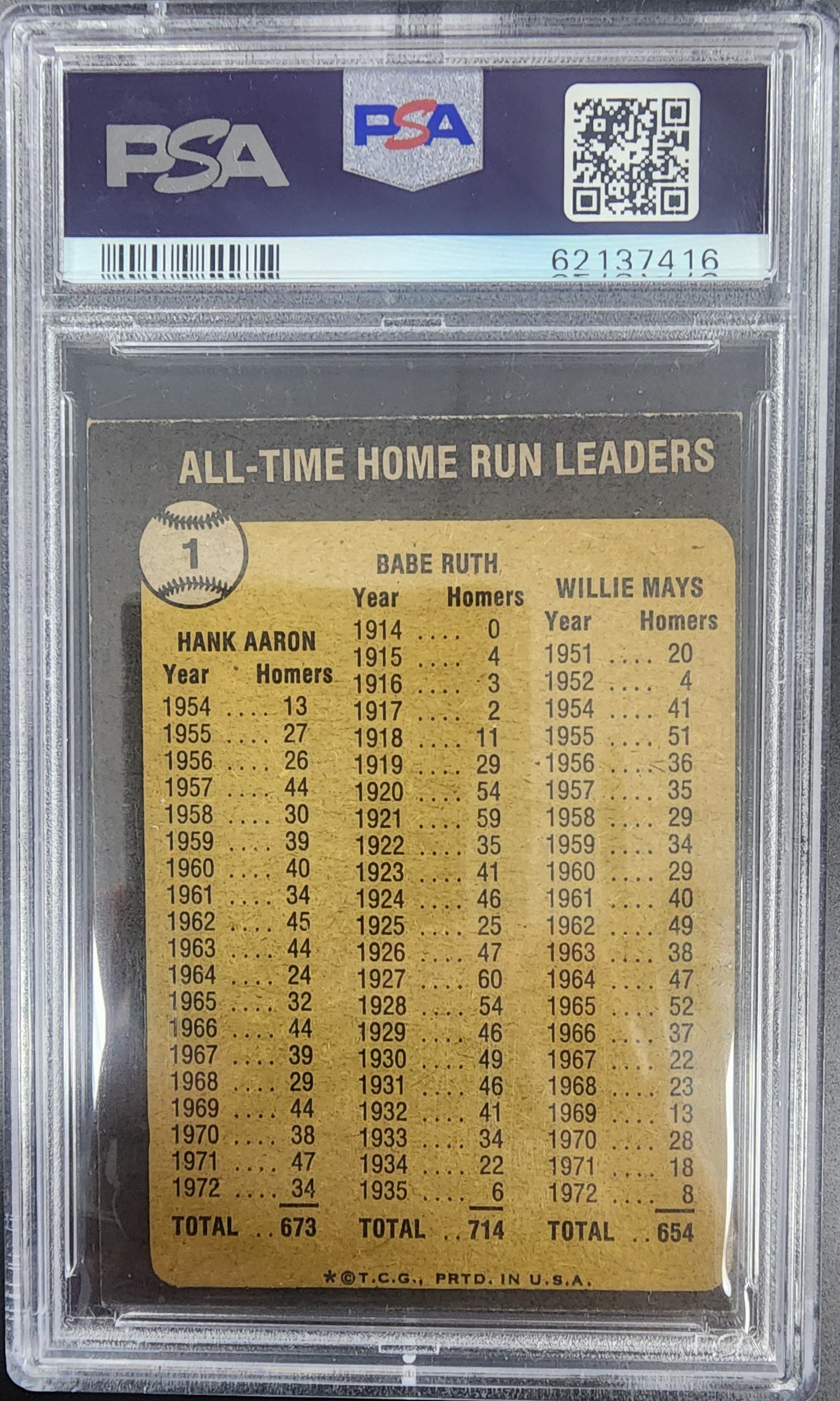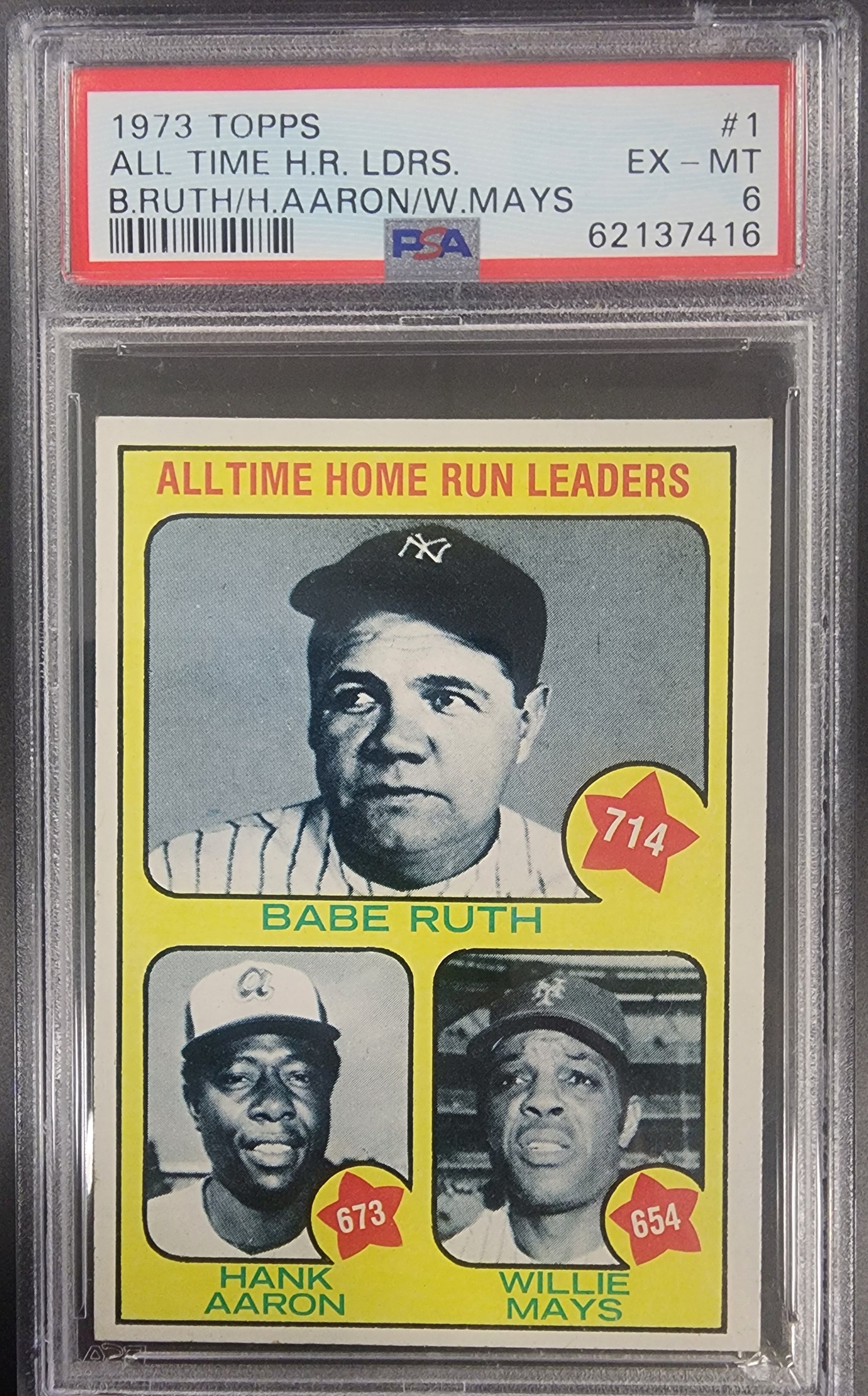 Babe Ruth + Hank Aaron + Willie Mays 1973 Topps Home Run Leaders #1 PSA 6 EX-MT