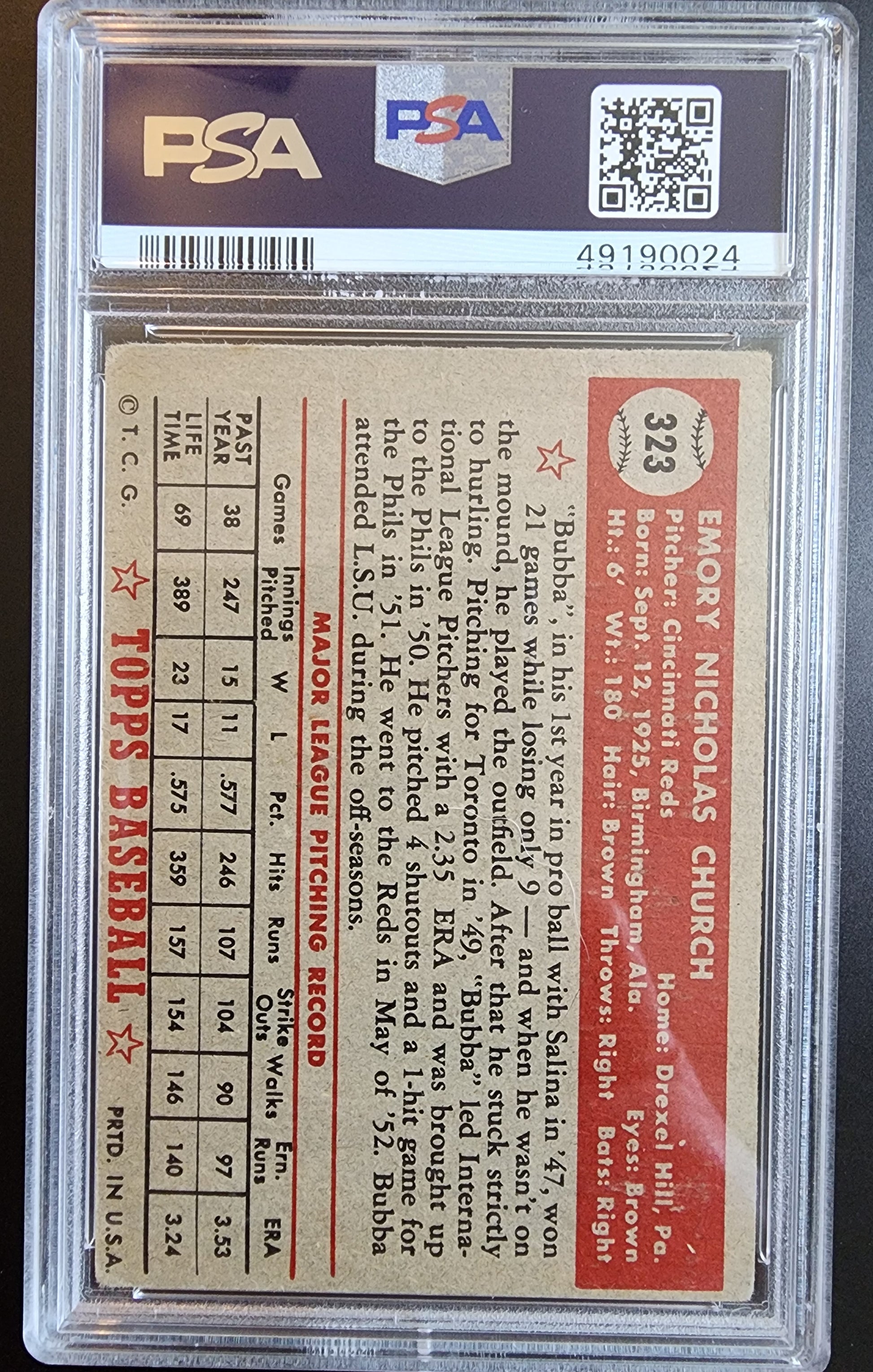 Bubba Church 1952 Topps #323 PSA 3