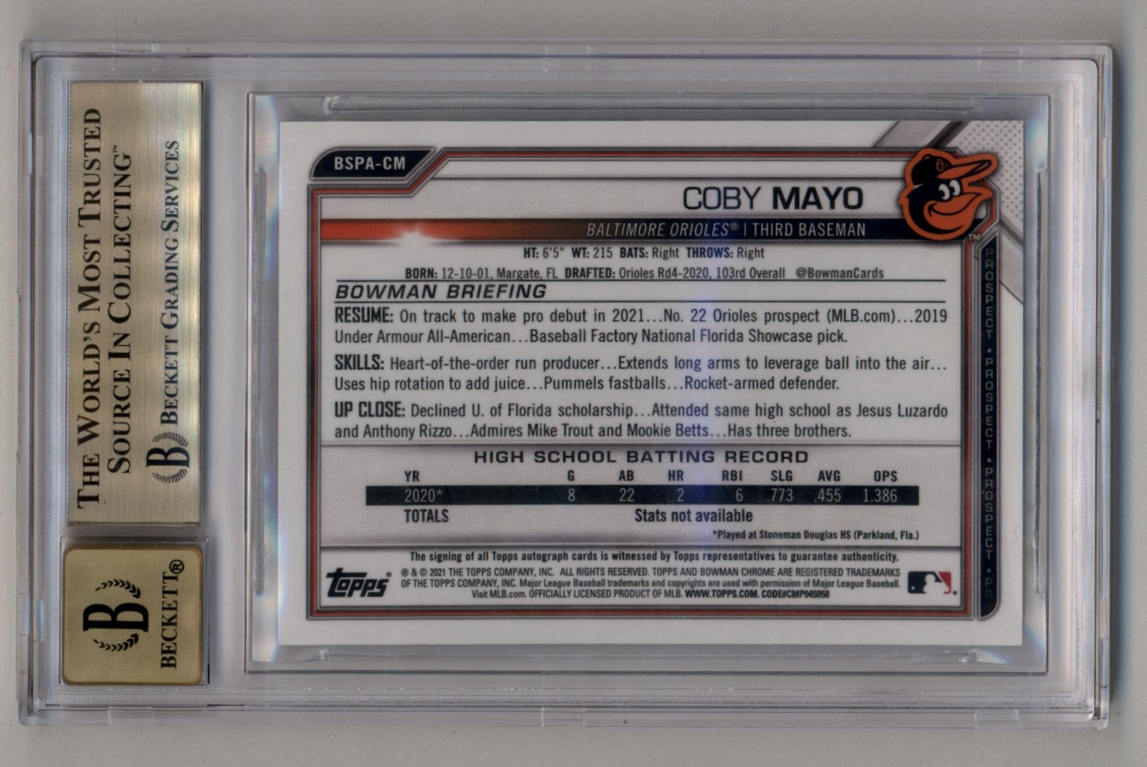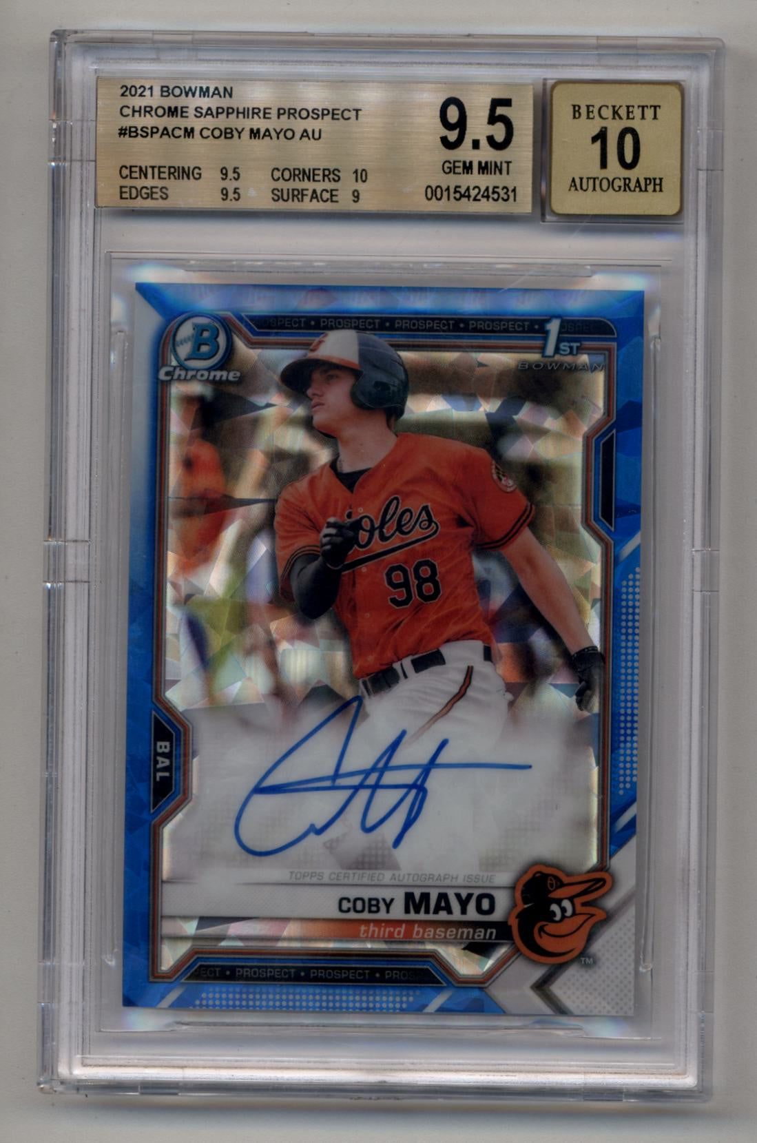 Coby Mayo 2021 Bowman Chrome Prospect Sapphire Auto BGS 9.5 Gem Mint Auto 10