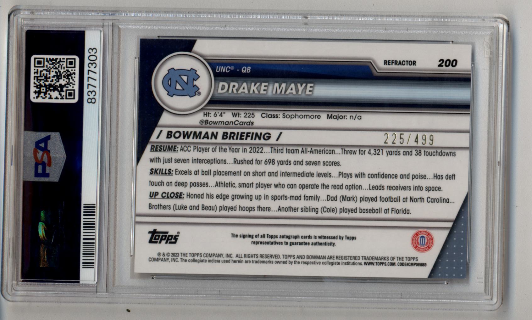 Drake Maye 2023 Bowman Chrome University Refractor 225/499 Auto PSA 10 Gem Mint