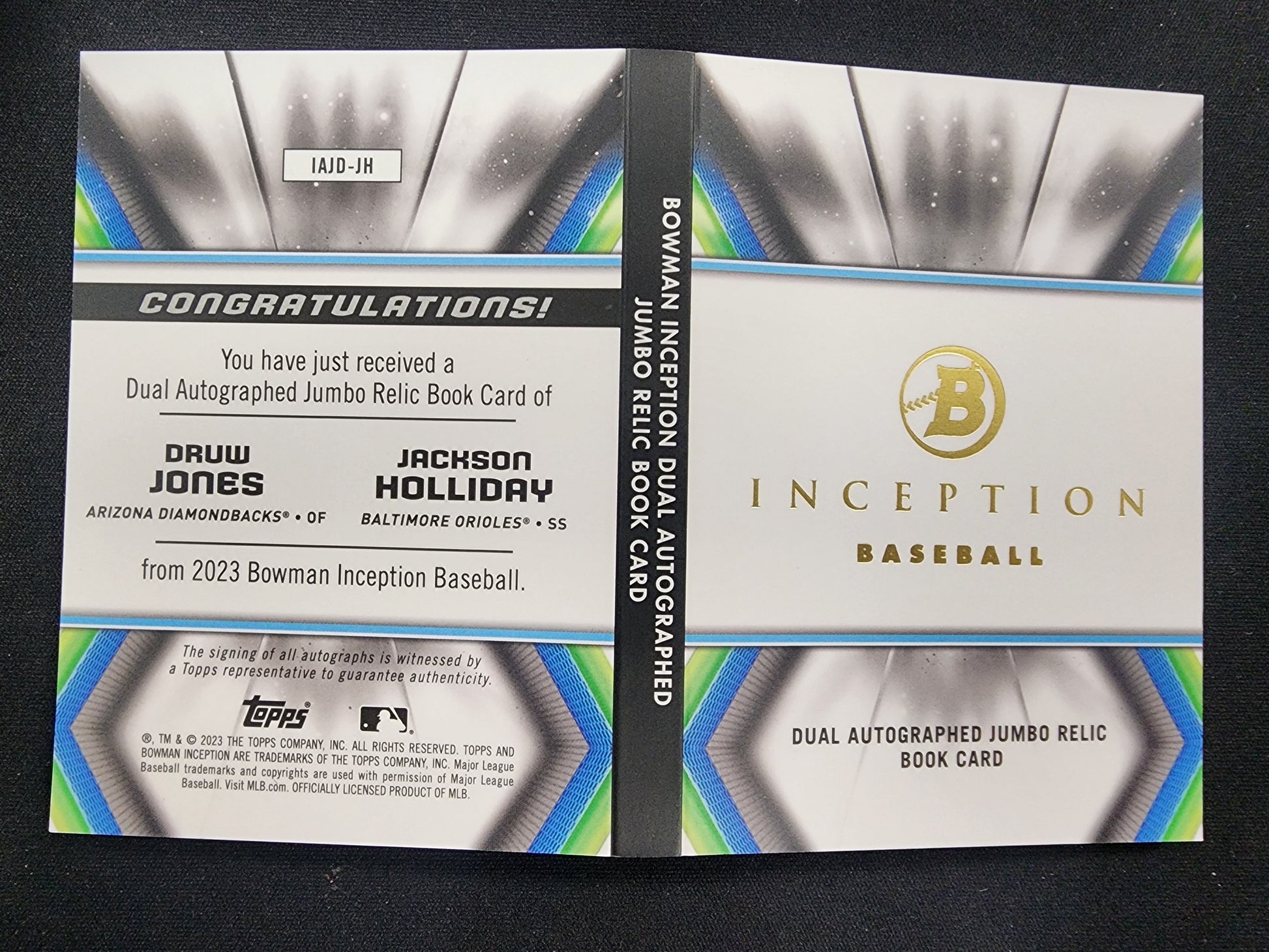 Druw Jones + Jackson Holliday 2023 Bowman Inception Jumbo Relic Auto Book #36/50