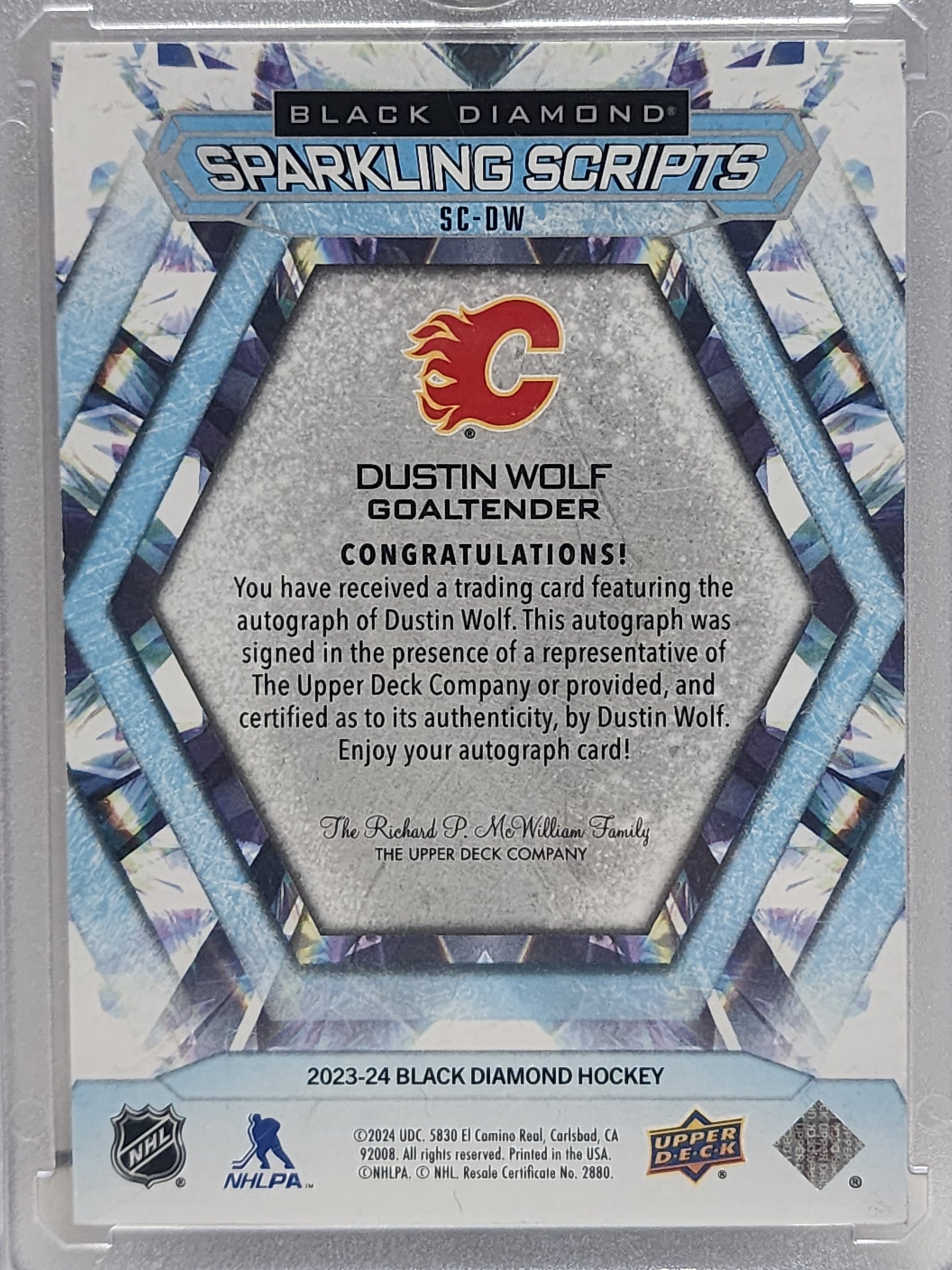 Dustin Wolf 2023 Upper Deck Black Diamond Sparkling Scripts Auto #9/10