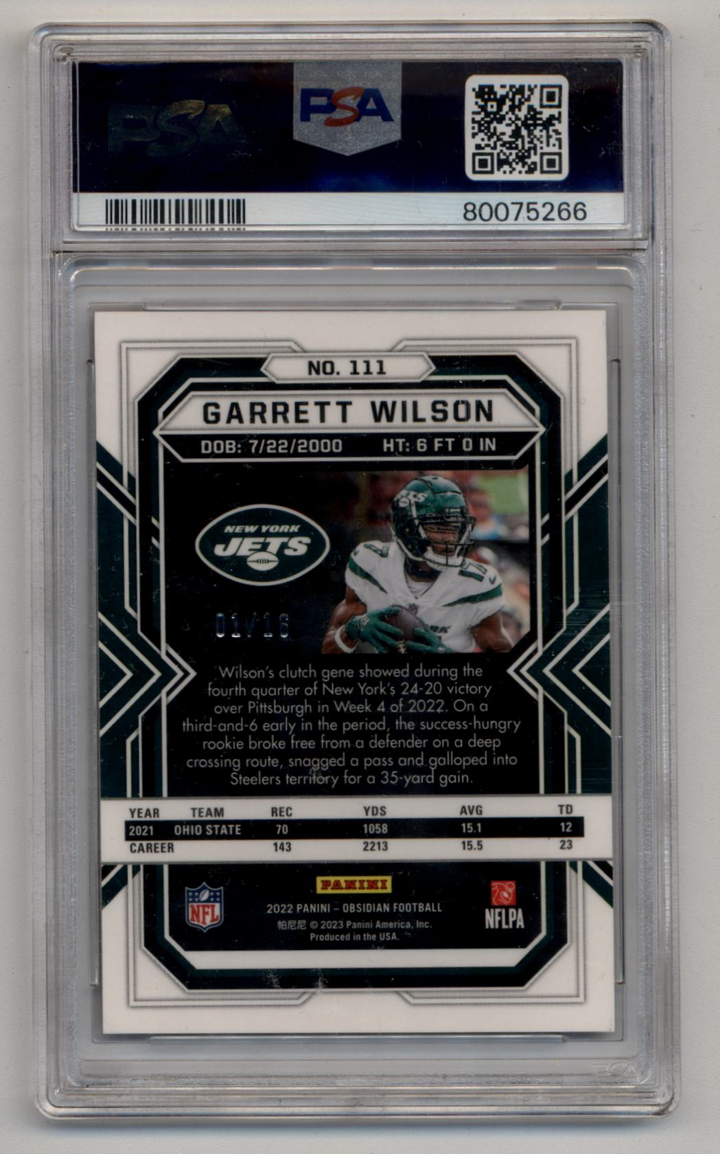 Garrett Wilson 2022 Obsidian Electric Etch Purple Flood 01/16 PSA 10 Gem Mint
