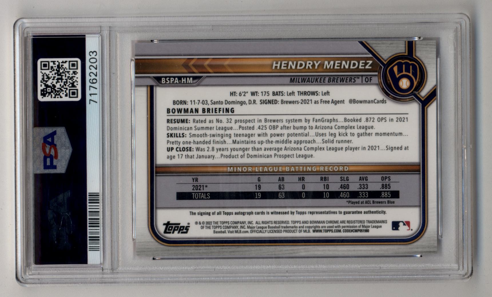 Hendry Mendez 2022 Bowman Chrome Prospects Red Refractor Auto 2/5 PSA 8 Near Mint- Mint Auto 10