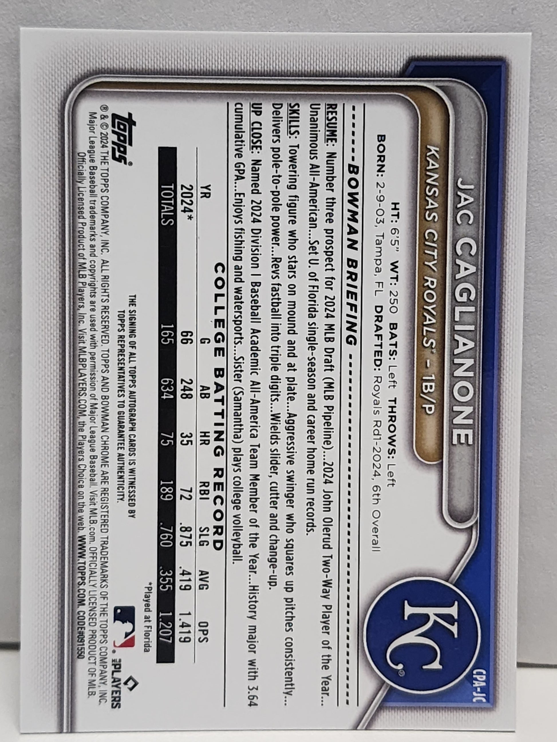 Jac Caglianone 2024 Bowman Chrome Autograph