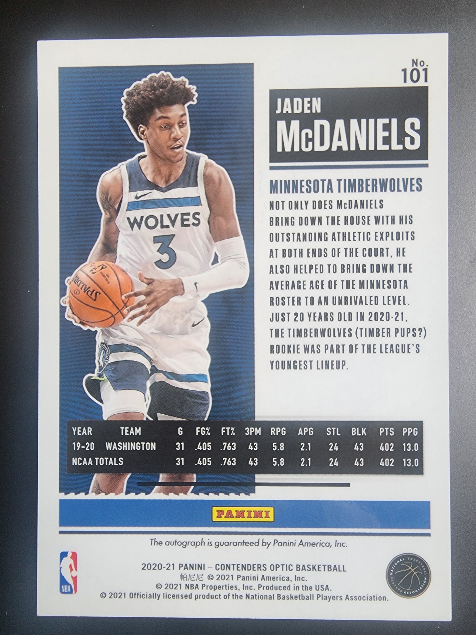 Jaden McDaniels 2020 Panini Contenders Optic #101 Rookie Auto