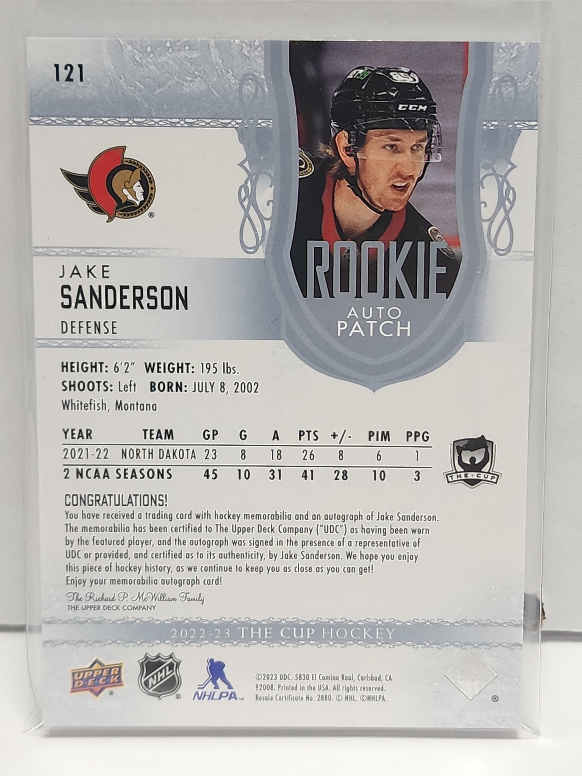 Jake Sanderson 2022 Upper Deck The Cup Rookie Patch Auto #24/249