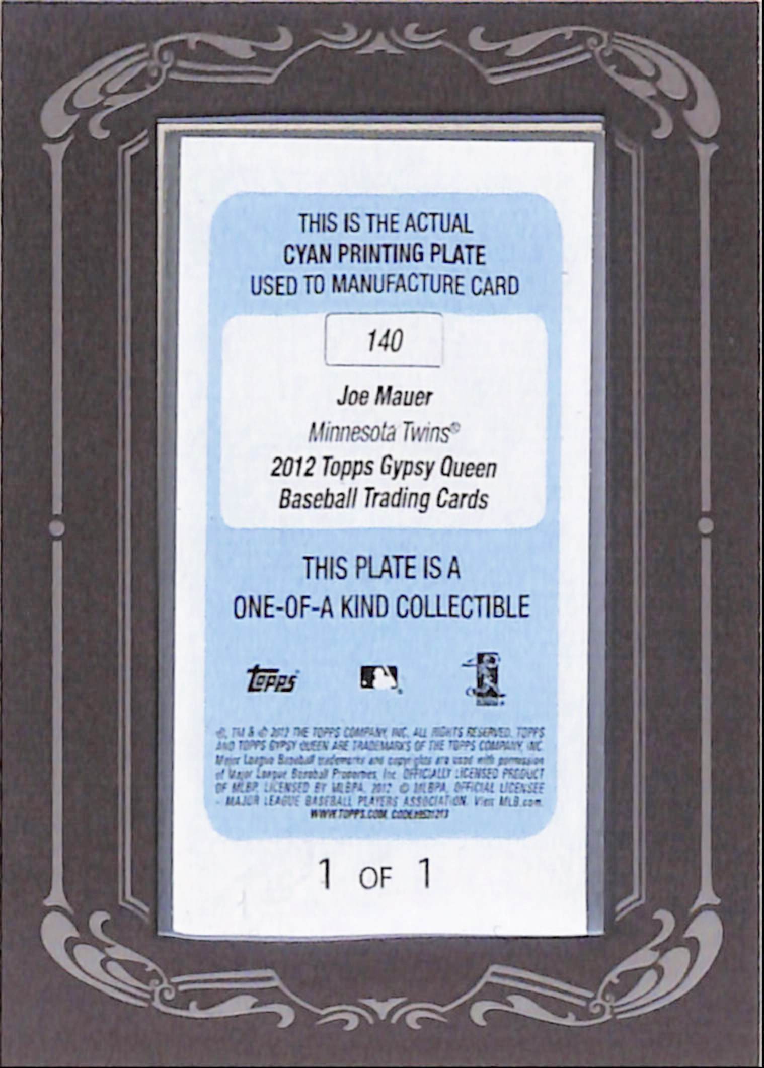 Joe Mauer 2012 Topps Gypsy Queen 1/1 Cyan Printing Plate