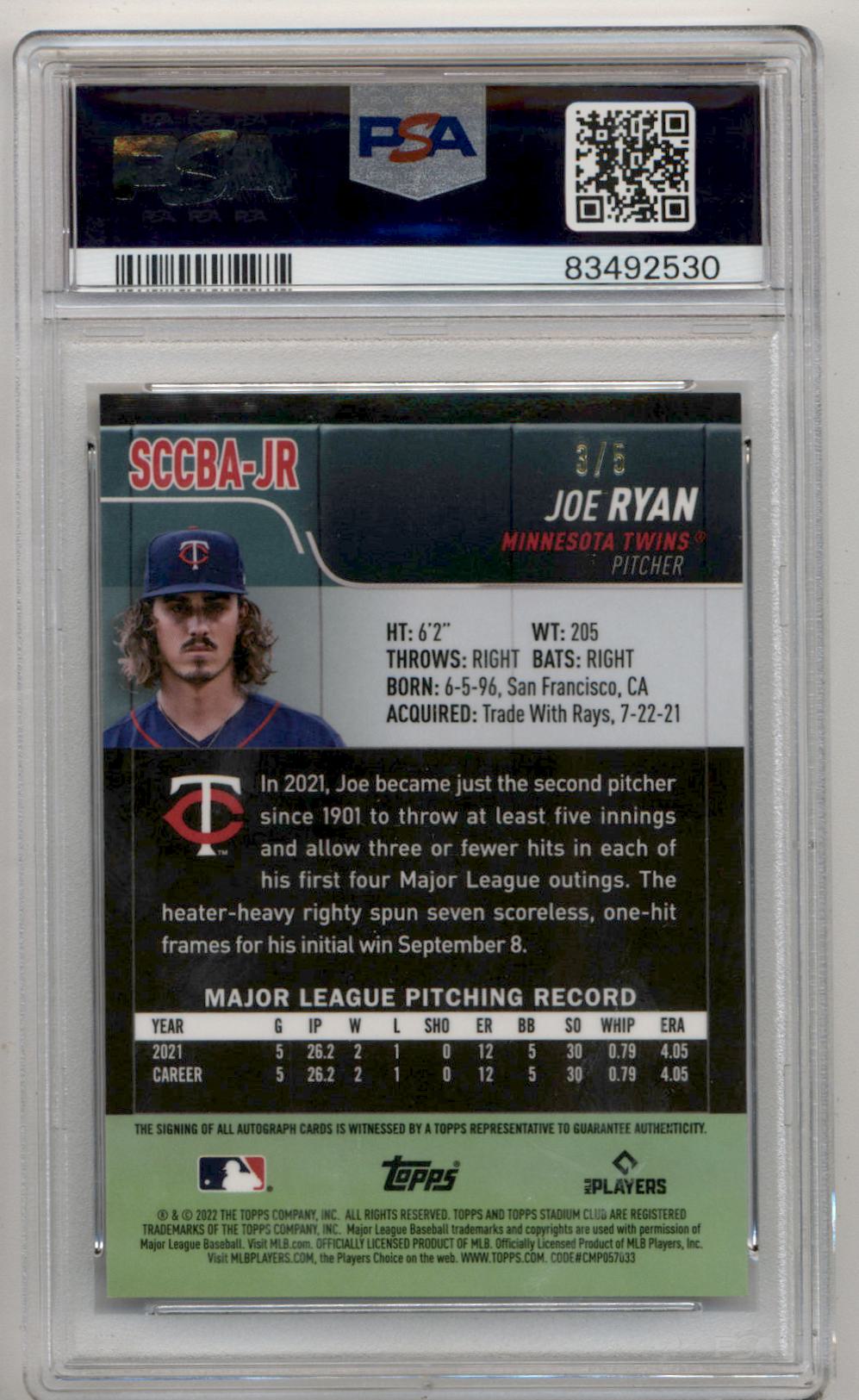 Joe Ryan 2022 Topps Stadium Club Chrome Shimmer Refractor Auto #3/5 PSA 10 Auto 10