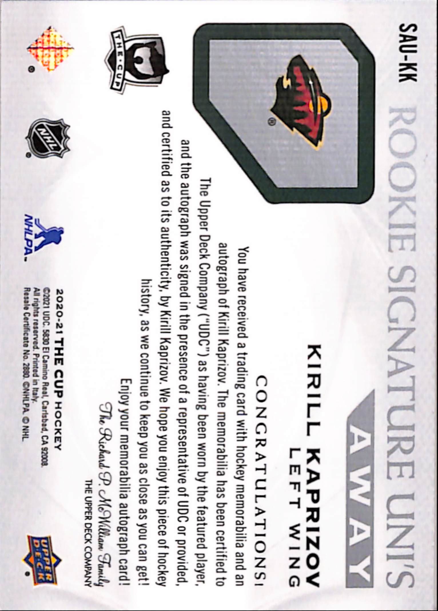 Kirill Kaprizov 2020 Upper Deck The Cup Rookie Signatures Away Patch Auto #43/49