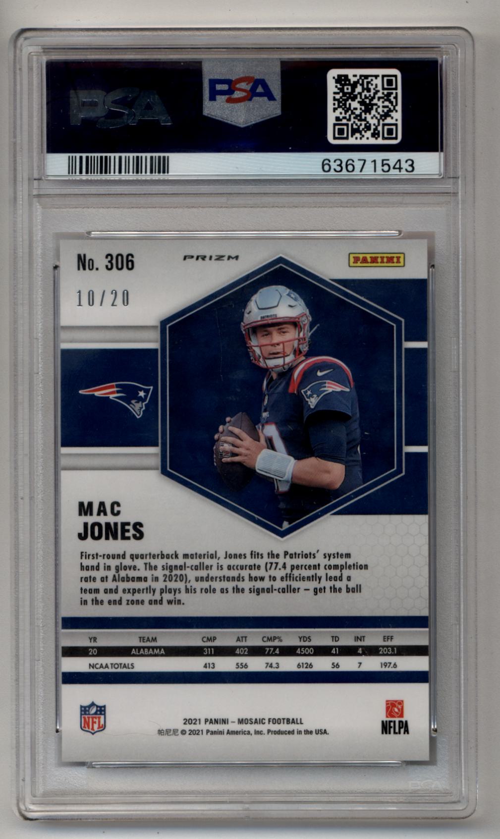Mac Jones 2021 Mosaic No Huddle Pink #306 10/20 PSA 10 Gem Mint
