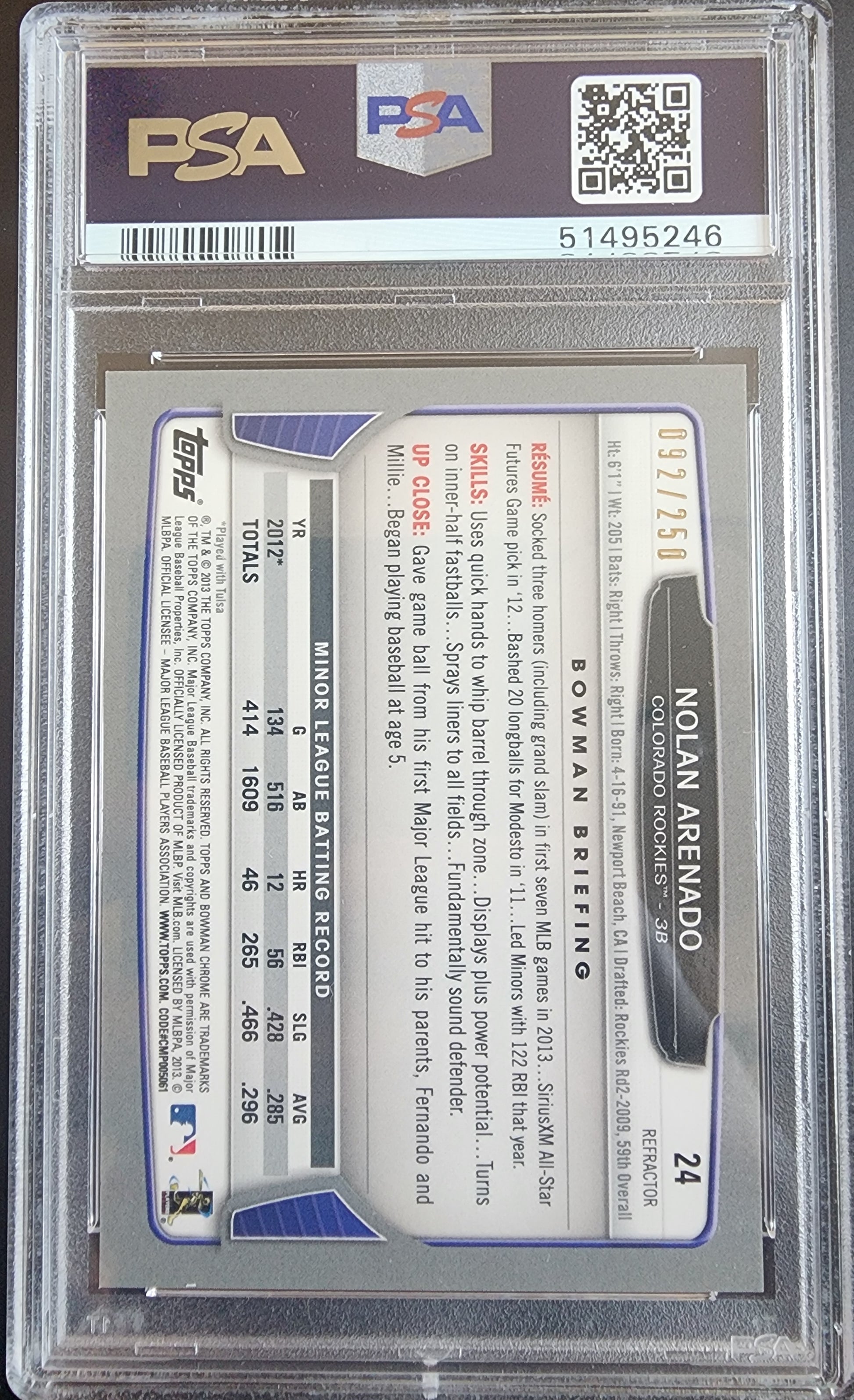 Nolan Arenado 2013 Bowman Chrome #24 Blue Refractor #92/250 PSA 9 Mint