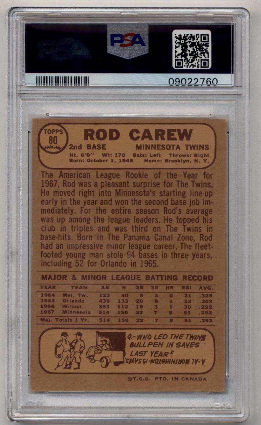 Rod Carew 1968 O-Pee-Chee #80 PSA 7 Near Mint