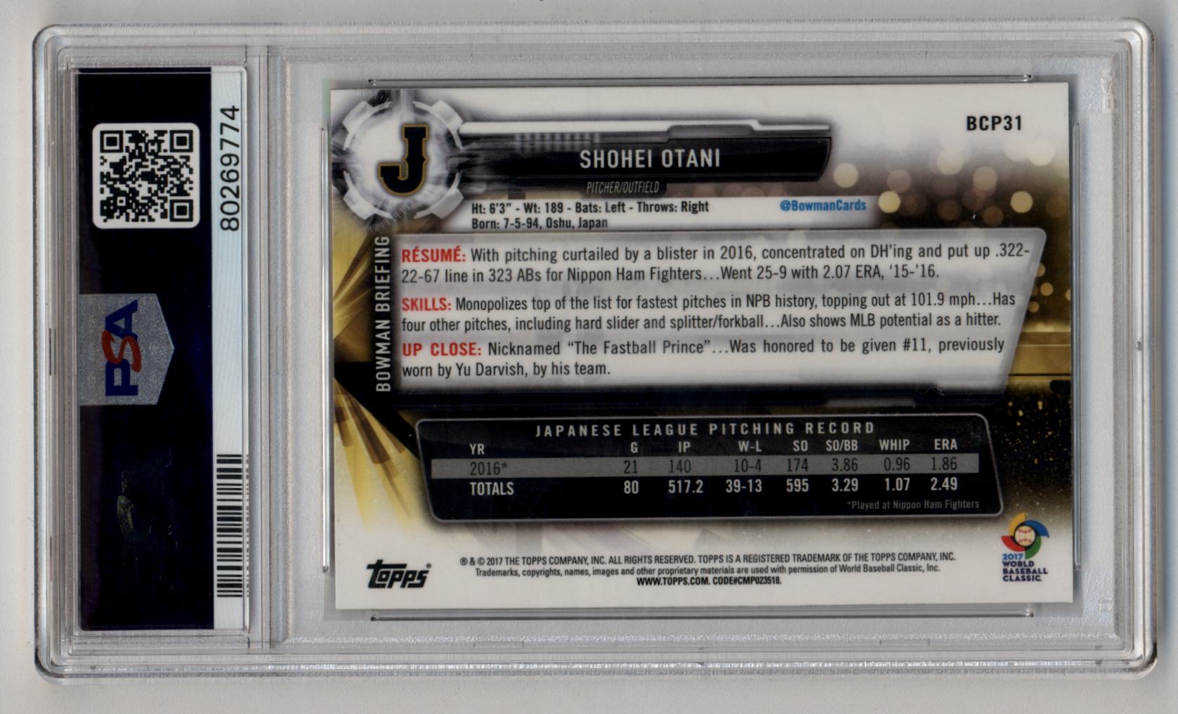 Shohei Ohtani 2017 Bowman Mega Box Chrome Prospects #BCP31 PSA 10 Gem Mint 9774