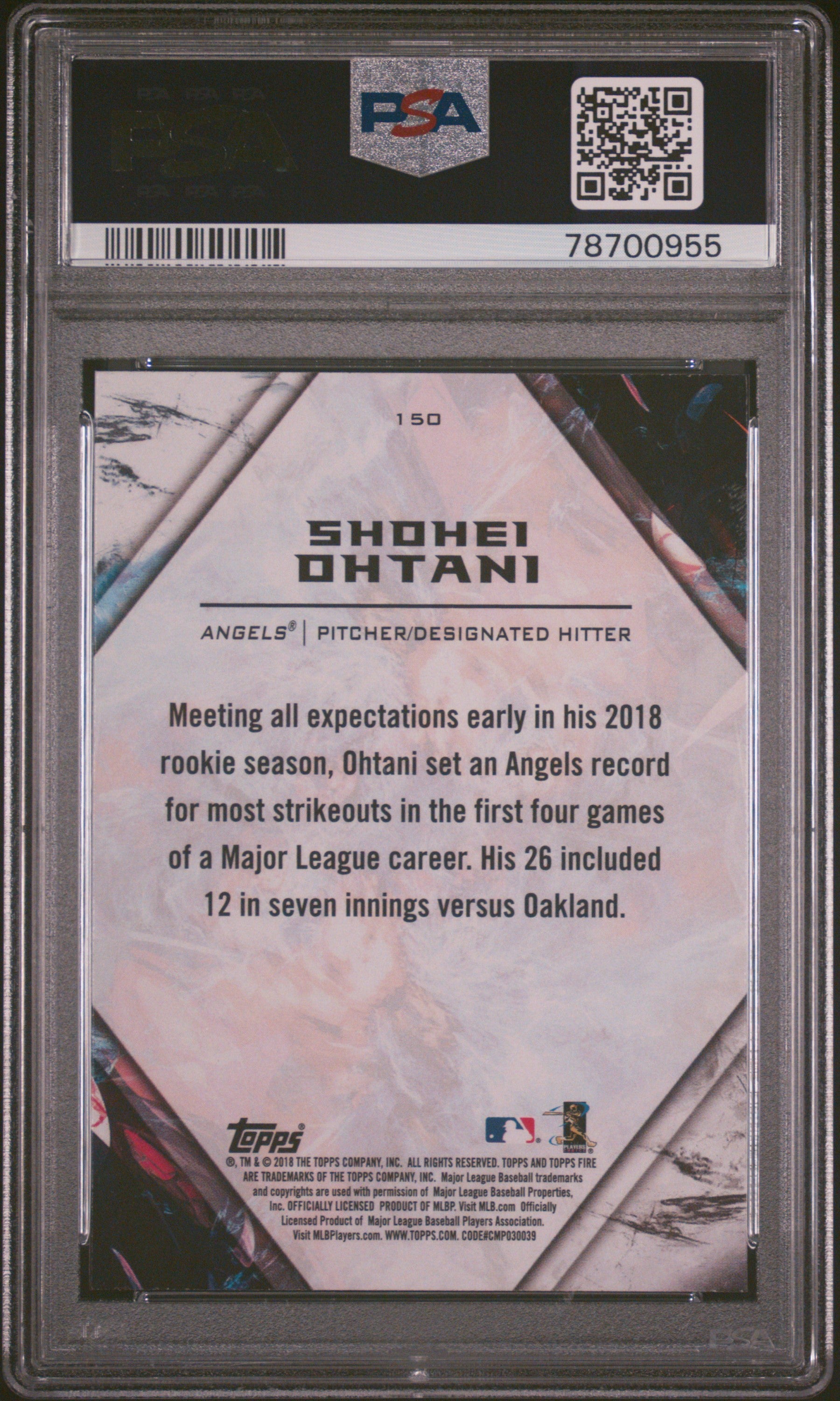 Shohei Ohtani 2018 Topps Fire #150 PSA 10 Gem Mint 0955