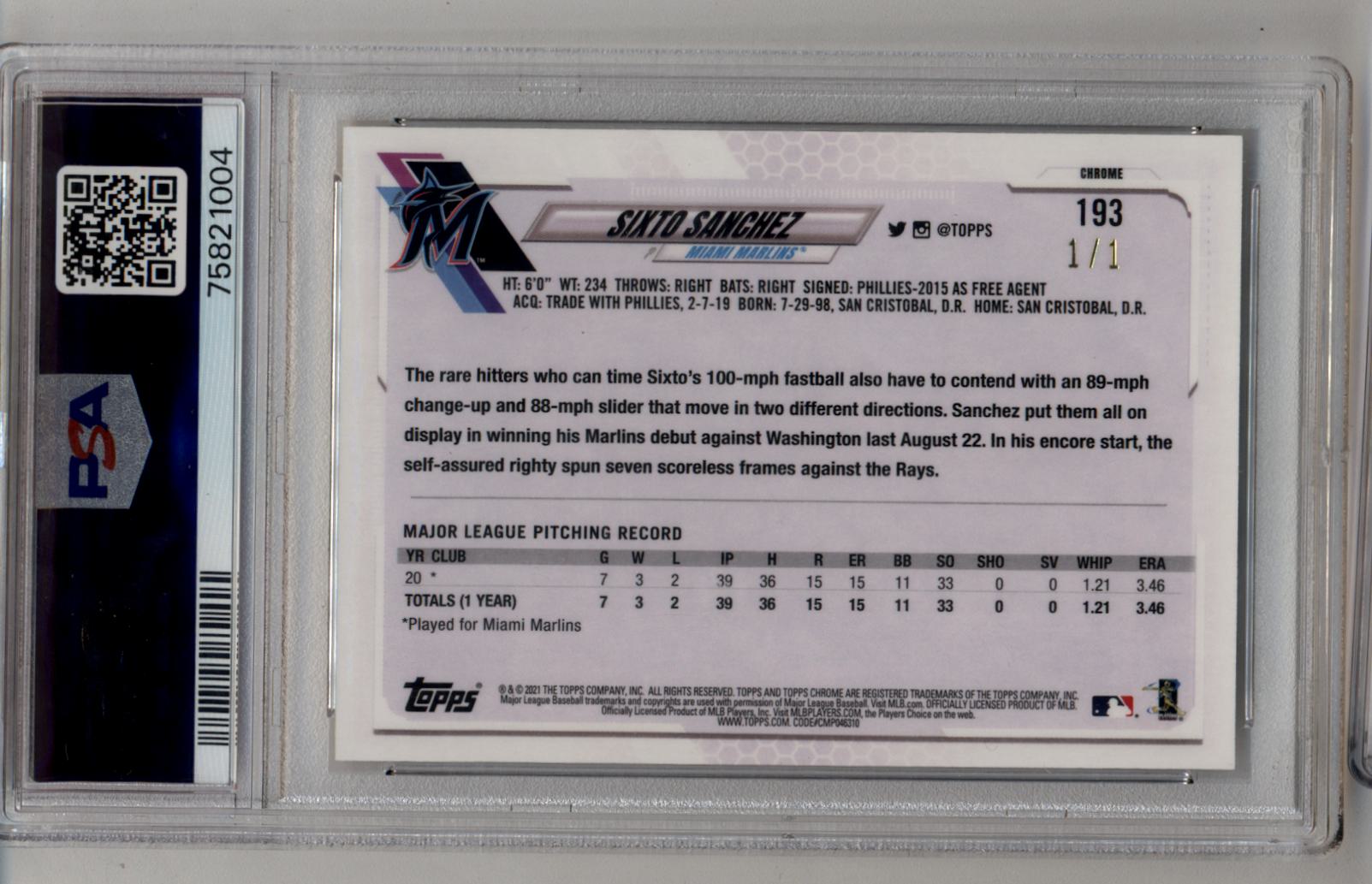 Sixto Sanchez 2021 Topps Chrome Superfractor #193 1/1 PSA 10 Gem Mint