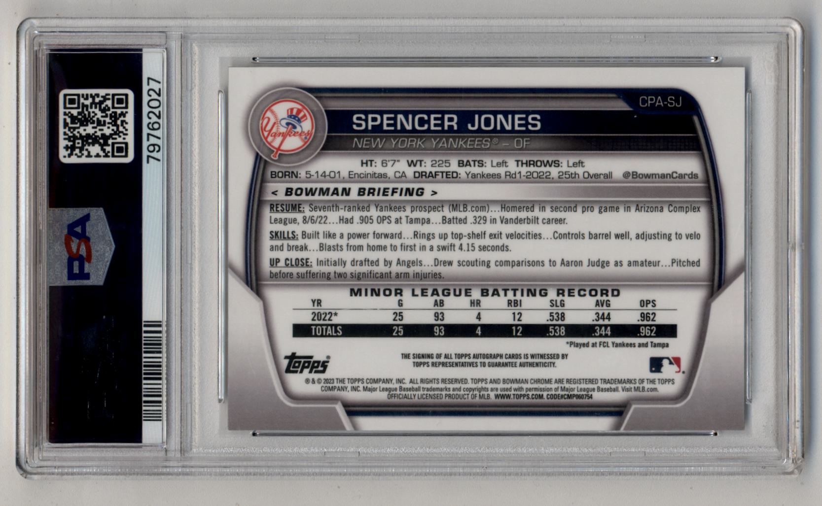 Spencer Jones 2023 Bowman Chrome Prospect Auto PSA 10 Gem Mint 2027