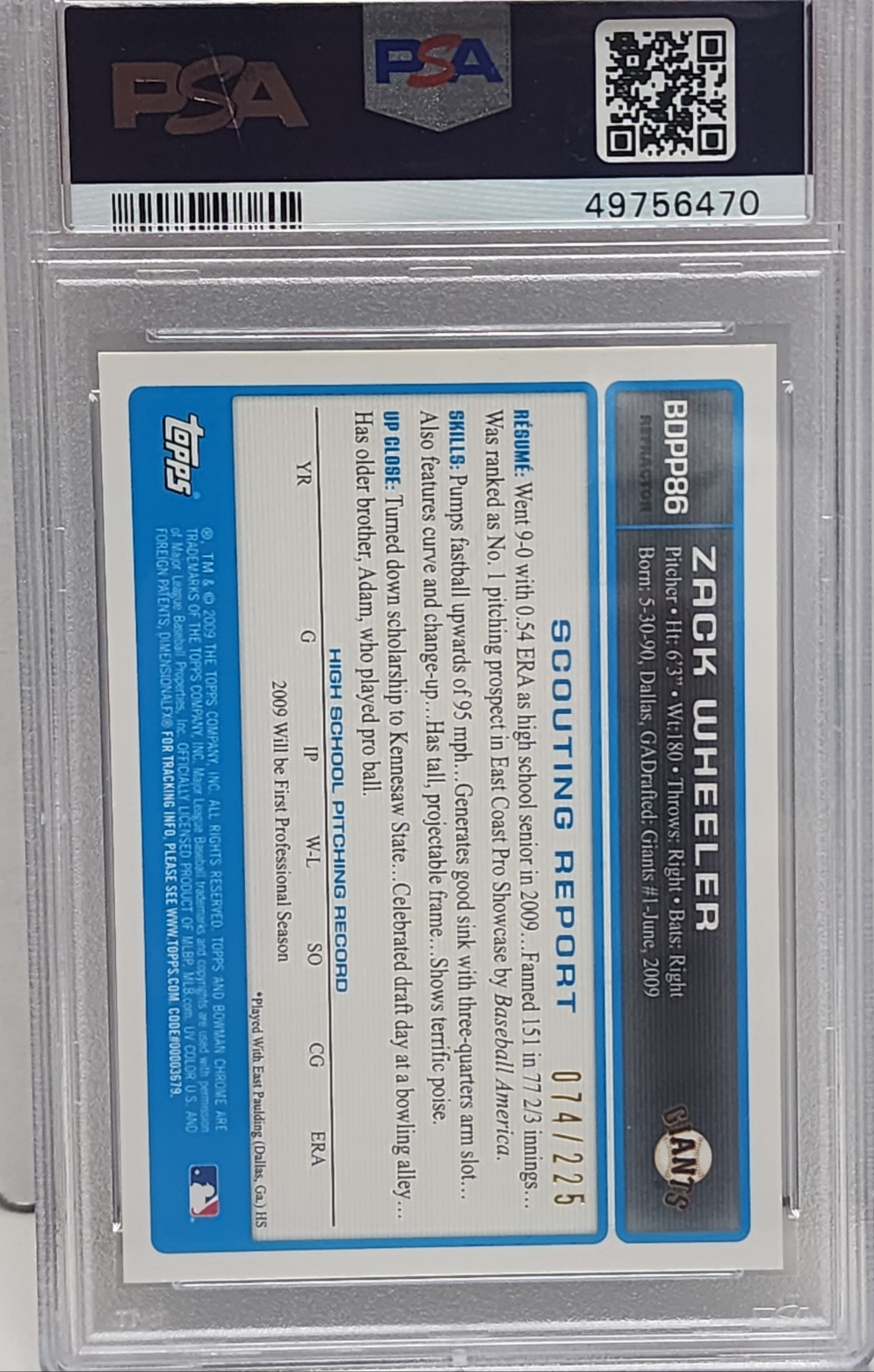 Zack Wheeler 2009 Bowman Chrome Draft Xfractor Auto #74/225 PSA 10 Gem Mint